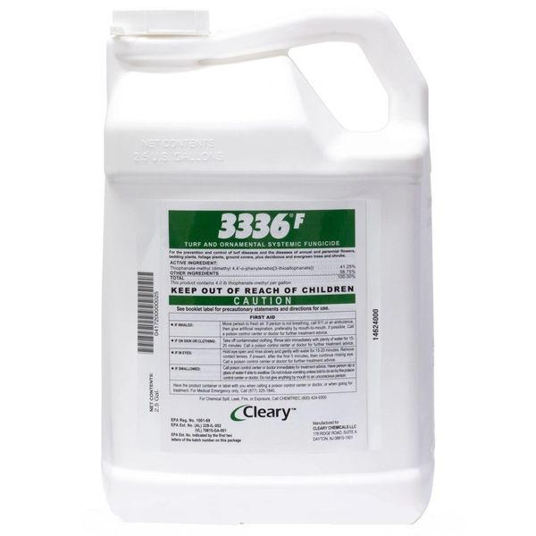 Cleary's 3336 F Turf and Ornamental Fungicide | Free Shipping Clearys 3336 F Turf and Ornamental Fungicide with thiophanate methyl is a systemic fungicide for the prevention and control of turf and ornamental diseases. It can be used on residential lawns, golf courses, commercial lawns, sod farms, greenhouses, nurseries and interiorscapes. Skip to the end of the images gallery Clearys 3336F Fungicide - Phoenix Environmental Design Inc. Stop fungal diseases from spreading with Clearys 3336F broad-spectrum fungicide. It works on residential, commercial and recreational turf and kills troublesome fungus on trees, shrubs, flowers and grass. Clearys eliminates fungi on the spot while preventing spore germination and further contamination of the area. DIRECTIONS FOR USE: