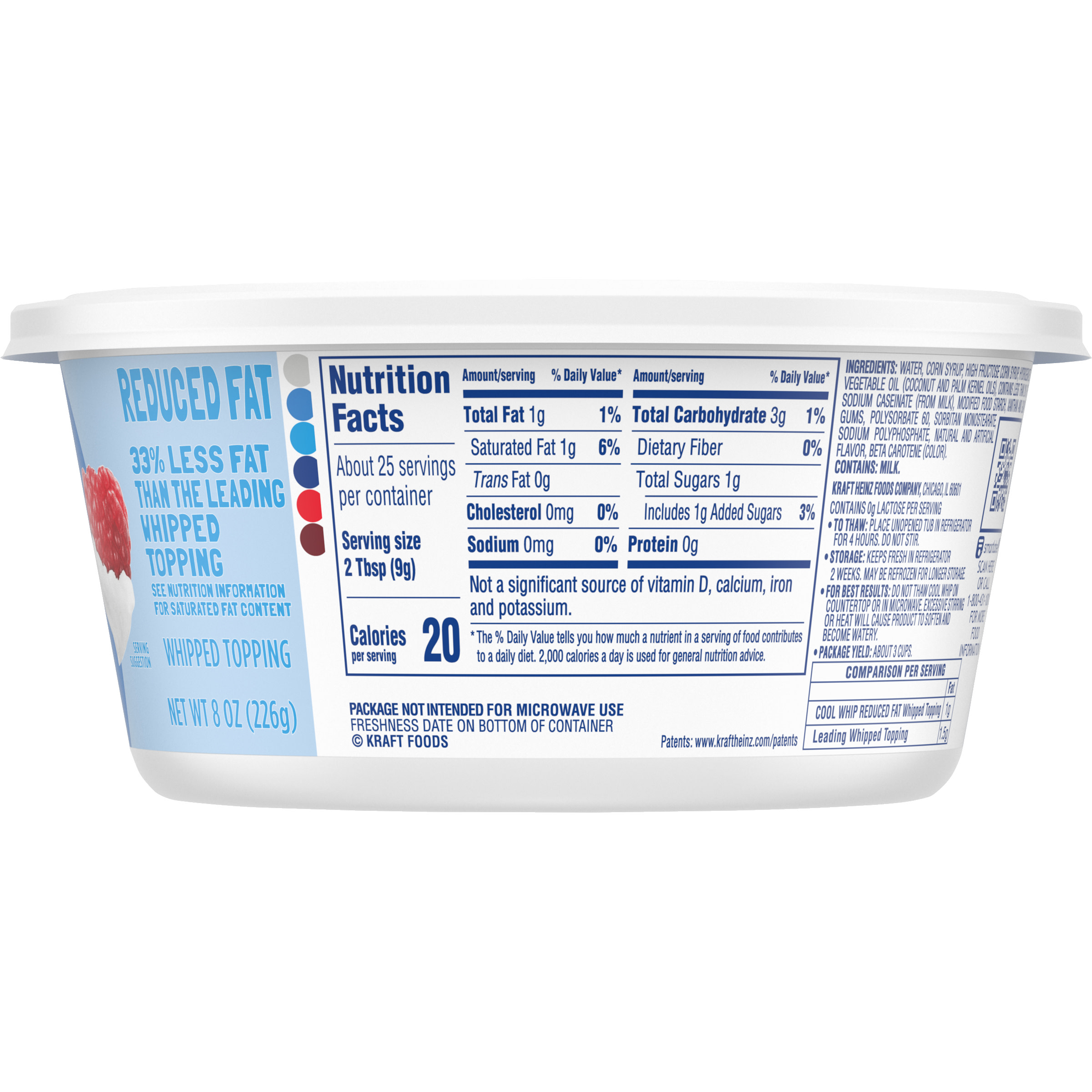 Cool Whip Whipped Topping, Lite - Cub Cool Whip Whipped Topping, Lite, 8 Ounce ; 20kcal. Calories ; 0.5g. Total Fat ; 2g. Total Sugars ; 0mg. Sodium.