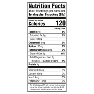 Triscuit Crackers, Original: calories, nutrition analysis & more ... Potassium 115 mg 2% Total Carbohydrate 20 g 9% Dietary Fiber 3 g 12% Sugars 0 g 0% Added Sugars 0 g 0% Protein 3 g 6% Vitamin A 0 mcg 0% Vitamin C 0 mg 0% Calcium 0 mg 0% Iron 1.44 mg 8% Ingredients INGREDIENTS: WHOLE GRAIN WHEAT, VEGETABLE OIL (SOYBEAN OR CANOLA OIL), SEA SALT. FooducateUser Apr 17 2011 I hate these crackers! No rating original triscuits nutrition label Triscuit hy nabisco 30 Triscuit Nutrition Facts Label - Labels Database 2020. 35 Wheat Thins Reduced Fat Nutrition Label - Labels Information List. Whole Grain vs Original Wheat Thins. 30 Triscuit Nutrition Facts Label - Labels Database 2020. Nabisco Triscuit Thin Crisps Original | Hy-Vee Aisles Online Grocery. Triscuit Nutrition Facts - Eat This Much Triscuit Nutrition Facts - Eat This Much Triscuit Fire Roasted Tomato & Olive Oil - Nabisco Find on Amazon Percent calories from... Quick stats 120 Calories 20g Carbs (17g net carbs) 4g Fat 3g Protein No price info Try our free Diet Generator I want to eat calories in meals. I like to eat Not the food you're looking for? Try these: Triscuits