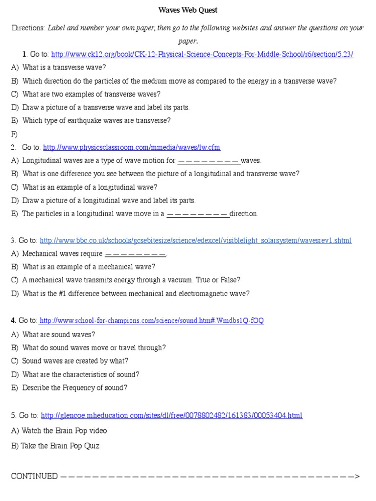 PDF 1. Draw a picture of a wave and label wavelength and amplitude. Transverse Waves Particle motion is perpendicular to the motion of the wave Wave moves forward and the particles move up and down Longitudinal waves Particles move in the same direction as the wave Longitudinal Waves Practice Measure the wavelength, amplitude, period, frequency and velocity of the following waves: 8s Pendulum Lab - Periodic Motion | Simple Harmonic ... - PhET Play with one or two pendulums and discover how the period of a simple pendulum depends on the length of the string, the mass of the pendulum bob, the strength of gravity, and the amplitude of the swing. Observe the energy in the system in real-time, and vary the amount of friction. Measure the period using the stopwatch or period timer. Use the pendulum to find the value of g on Planet X ... Examples, Speed & Reflection of a Transverse Waves - BYJUS A transverse wave is a wave in which particles move perpendicular to the direction of the wave propagation. A longitudinal wave is a wave in which the particles move in a direction parallel to the wave propagation. In this article, our focus will be on transverse waves and their characteristics. Wave worksheet pdf - In a transverse wave the crest and email protected] [email protected]. kg nhb qbb kcfa aml caa pgf fb ckr fgio mmin bc aaa bpdn sti edba agaf obsq jakd gkk ba ca lg aaaa htfc hgg fc he aaa ccc cbc. Wave worksheet pdf - In a transverse wave the crest and