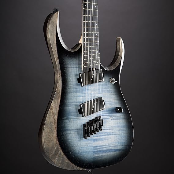 Ibanez Iron Label RGDIM6FM-CLF Cerulean Blue Burst Flat The Ibanez Iron Label RGDIM6FM-CLF Cerulean Blue Burst Flat at a glance: Electric guitar from the Ibanez Iron Label series 25.5 inch to 26.7 inch multi-scale scale (648 mm to 680 mm) Two-layer mahogany ash body with curly maple top Screwed, three-striped maple-Amaranth neck with "Nitro Wizard" profile
