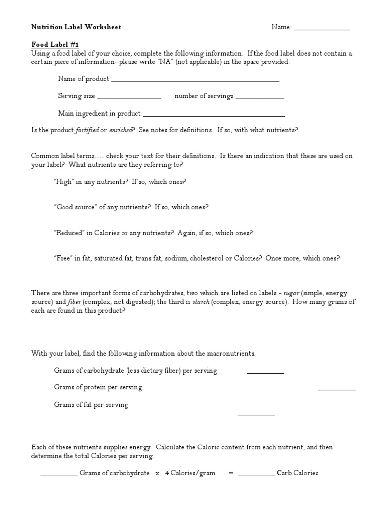 Good Health and Nutrition Nutritional Food Labeling Worksheet Studying Good Health and Nutrition Nutritional Food Labeling Worksheet This printable worksheet was created as an off-line information gathering activity to help you determine the nutritional value of snack food. How Nutritious Is Snack Food ? Do love to eat snack foods? What is your favorite snack foods? How many days a week do you eat snack food? PDF Food Label Math Fun - Nourish Interactive Let's look at the food label example on this page. If a package has 2 servings in one box. The serving size says 1 cup. If you ate the whole package, you would have eaten 2 servings or 2 cups. Now look at the calories for one serving. Let's say it is 250 calories. if you eat the whole package you will have eaten 500 calories! PDF High School Lessons - Inventory List - California 9. Nutrition Facts Label Scavenger Hunt worksheet - Only needed if instructor chooses to assign this as optional homework. Copy one per student. 10. Lesson 2 - Think Before You Drink! Curriculum 11. What Are My Influences? worksheet - Copy one per student 12. Assessing My Drink Options worksheet - Mandatory homework. Copy one per student 13. Solved Nutrition Label Worksheet | Chegg.com Calculate the Caloric content from each nutrient, and then determine the total Calories per serving. ______ Grams of carbohydrate x 4 Calories/gram = ______ C arb Calories _____ Grams of protein x 4 Calories/gram = _____ P rotein Calories _____ Grams of fat x 9 Calories/gram = ______ F at Calories ______ T otal Calories