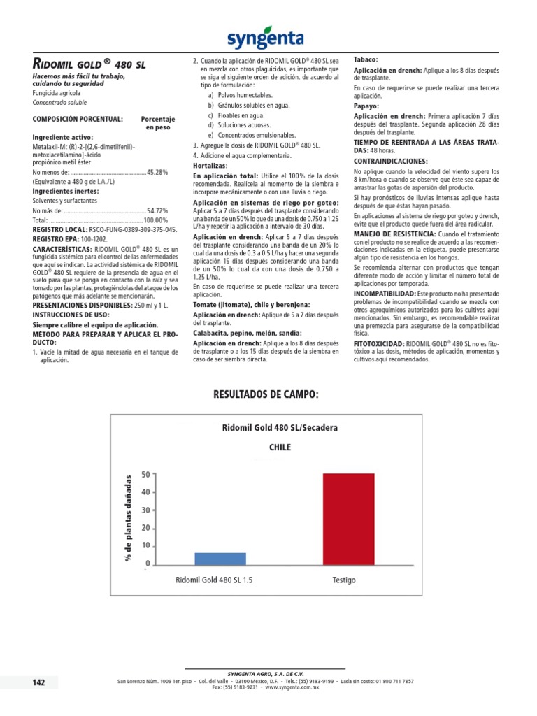 RIDOMIL GOLD® BRAVO SC - Fungicida | Syngenta RIDOMIL GOLD® BRAVO SC es una mezcla de fungicidas con distinto modo de acción. Metalaxil-M es un fungicida que actúa en forma sistémica penetrando en la planta, donde se transloca por el sistema vascular a otros tejidos. Proporciona control de las enfermedades indicadas más adelante, en los cultivos aquí registrados.