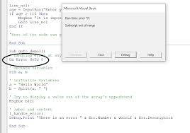 VBA GoTo | How to Use Excel VBA Goto Statement? - EDUCBA VBA Goto Statement is used for overcoming the predicted errors while we add and create a huge code of lines in VBA. This function in VBA allows us to go with the complete code as per our prediction or assumptions. With the help Goto we can go to any specified code of line or location in VBA.