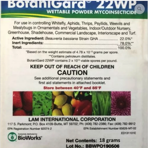 BotaniGard 22WP | Beauveria bassiana Wettable Powder - ARBICO Organics BotaniGard 22WP controls multiple life stages of a wide variety of soft-bodied insects in greenhouse, field and nursery crops. Commonly controlled insects include whiteflies, thrips, aphids, psyllids, mealybugs, beetles, plant bugs and weevils. BotaniGard 22WP has the highest spore count of any Beauveria -containing insecticide.