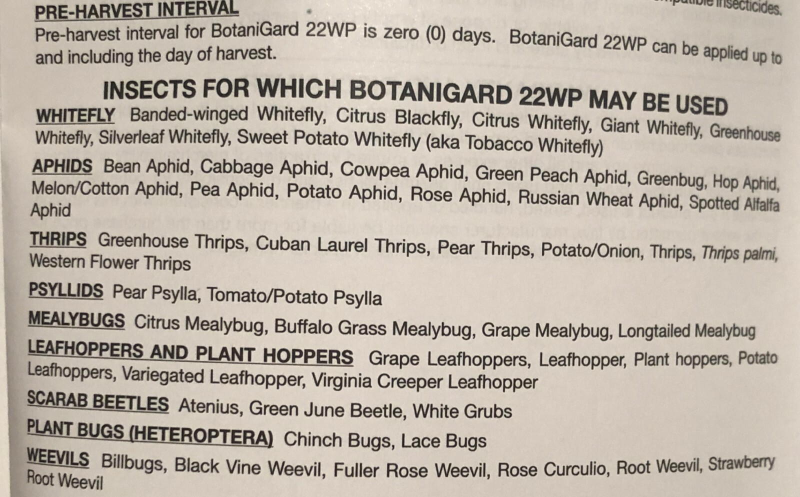 BotaniGard® ES & 22WP - GreenMethods BotaniGard® ES & 22WP Description BotaniGard® Mycoinsecticide is an effective biological insecticide that is used to control whitefly, thrips, aphids, and many other insects. It is based on the highly successful fungus, Beauveria bassiana strain GHA, and controls the most troublesome crop pests - even resistant strains such as Q-biotype whitefly. BotaniGard 22WP Biological Insecticide - DoMyOwn.com BotaniGard 22WP Biological Insecticide is a biological wettable powder insecticide that controls the early and adult stages of insects. In turn, it prevents outbreaks and the need for rescue programs. It targets insects such as whiteflies, thrips, aphids, and mealybugs.