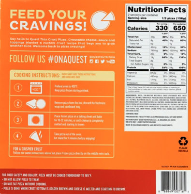Quest Quest® Thin Crust Pizza - Uncured Pepperoni Pizza is done when crust bottom is golden brown and cheese is melted and starting to brown. Keep frozen. Warnings Contains: milk may contain wheat. Nutrition Nutrition Facts Serving Size 162.00 g Servings Per Container 2 Amount Per Serving Calories 350 % Daily Value Total Fat 22g 34% Saturated Fat 8g 40% Trans Fat 0g Cholesterol 50mg 17%