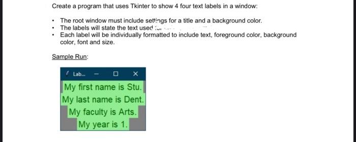 Python Tkinter - Label - GeeksforGeeks Aug 12, 2022 · Creating a GUI using Tkinter is an easy task using widgets. Widgets are standard graphical user interfaces (GUI) elements, like buttons and menus. Note: For more information, refer to Python GUI – tkinter. Label Widget. Tkinter Label is a widget that is used to implement display boxes where you can place text or images. Tkinter Label - Python Tutorial Set the background color for the label: borderwidth: Add a border around the label. class_ Specify a custom widget class name for changing the label’s appearance. compound: Specify how to display both text and image on the Label. cursor: Specify the mouse cursor’s appearance when the mouse is over the widget. font: Specify the font style ...