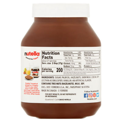 Nutella nutrition facts label. Nutella Pizza Nutrition Facts & Calories - Inlivo Rich in vitamins and minerals (10%/cal). Contains a low amount of risky components that may include saturated fat, cholesterol and sodium (0%/oz). This item has no fiber content (0% of DV/100g). Calories in 1 1 Slice (12 oz) 210 calories / 45 from fat Carbohydrates 25 g Proteins 4 g Fat 5 g Saturated Fat 3.3 g Calories Nutrition Risky Content Nutella Nutrition Facts: What's Really In It | The Beachbody Blog A serving of peanut butter (two tablespoons) contains 188 calories, 16 grams fat, 3 grams saturated fat, 8 grams carbs, 2 grams sugars, 7 grams protein, and varying amounts of sodium. No salt-added varieties have about five milligrams of sodium, while salted PB has about 152 milligrams. Nutella - Nutrition Label INGREDIENTS: Nutella Spread (Sugar, Palm Oil, Hazelnuts, Cocoa, Skim Milk, Reduced Minerals Whey (Milk), Lecithin as Emulsifier (Soy), Vanillin: an ... Nutella - Wikipedia Nutella (US: / n uː ˈ t ɛ l ə / noo-TEL-ə, UK: / n ʌ ˈ t ɛ l ə / nuh-TEL-ə, Italian: ) is a brand of sweetened hazelnut cocoa spread. [2] [3] [4] Nutella is manufactured by the Italian company Ferrero and was first introduced in 1964, although its first iteration dates to 1963.