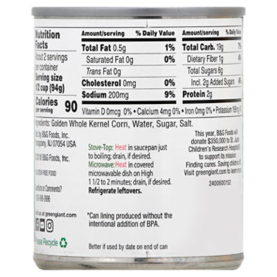 Green giant canned corn nutrition label