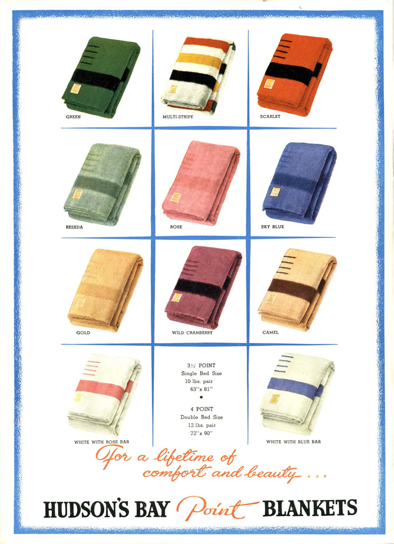Hudson's Bay point blanket - Wikipedia A Hudson's Bay point blanket is a type of wool blanket traded by the Hudson's Bay Company (HBC) in British North America, now Canada and the United States from 1779 to present. [1] The blankets were typically traded to First Nations in exchange for beaver pelts as an important part of the North American fur trade.