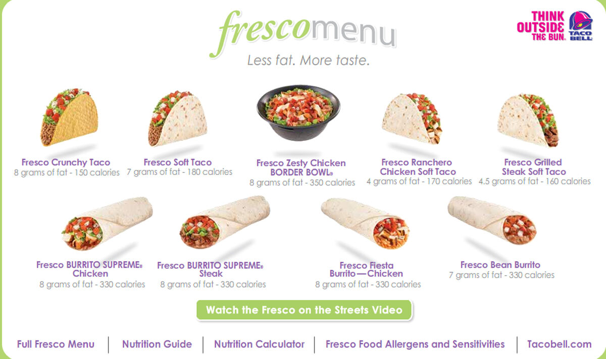 fastfoodnutrition.org › taco-bellTaco Bell Nutrition Facts & Calories - FastFoodNutrition.org Apr 14, 2023 · Taco Bell's menu is generally considered to be high in calories, fat, and sodium and is not considered a healthy fast-food option, although they do offer some lower-calorie options such as fresco-style menu items that replace cheese and sauces with pico de gallo. Items to avoid at Taco Bell include the Beefy 5-Layer Burrito, Quesarito, and ... Menu - Order Online | Taco Bell® View Nutrition Info Find Tacos Near You Today Order your favorite Taco Bell® menu items online or visit us at the Taco Bell location nearest you The Taco Bell menu has all of your favorite Mexican inspired foods. From classic tacos to burritos to our epic specialties and combos, there's something for everyone on the Taco Bell menu. Nutrition Information - Taco Bell UK Taco Bell uses Cookies to ensure that we give you the best experience on our website. To allow us to do this, we'd like you to consent to the use of cookies. Taco Bell Nutrition Information Taco Bell Nutrition Information Menu Locations Delivery Rewards Nutrition Gift Cards log in Stay Connected About Us Contact Us FAQS Careers Taco Bell Foundation Franchise Info Newsroom Blog Gift Cards Taco Shop Taco Bell Weddings Mobile App Offers and Deals Popular Links Cookie And Ads Privacy Policy Terms Of Use